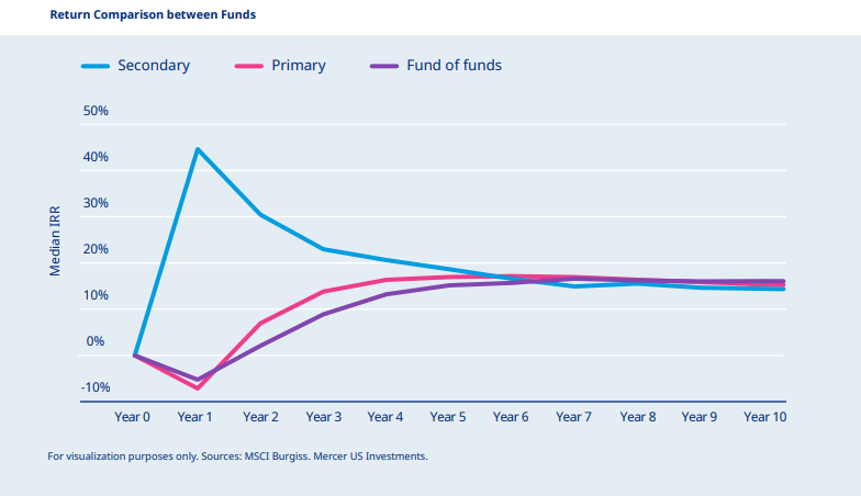 A comparison of the Internal Rate of Return (IRRs) of different PE strategies would highlight the impact of the J-curve mitigation. Secondary Funds possess a higher IRR due to quicker capital deployment, immediate valuation and the benefit of a discount as opposed to Primary Funds and Fund-of-Funds(FoF).